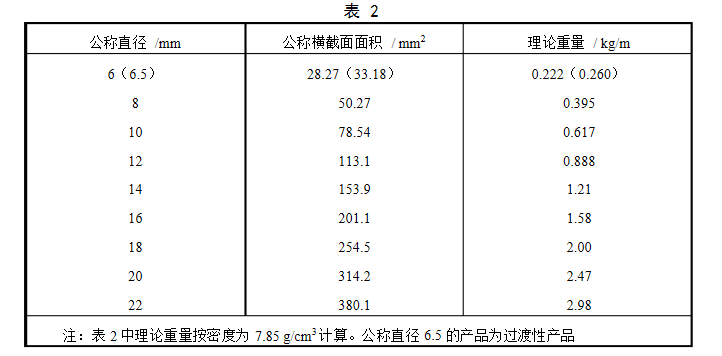 公稱橫截面積與理論重量如表2